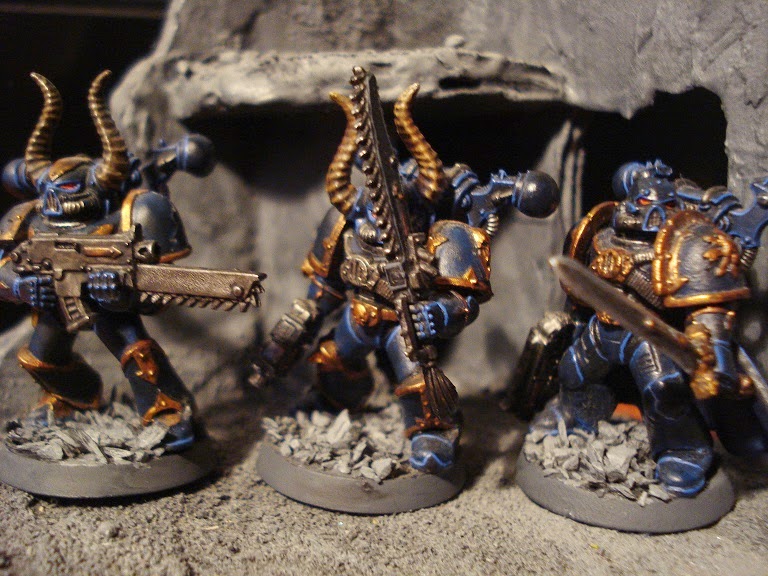 Next, the following models are re-takes on some of the Chaos Mercenary models that I worked on a while ago. I didn't like how some of them looked, and thought that they should look closer to their fluff. They didn't really follow any fluff other than "generic Chaos Space Marine", so it was easy to pick out a few details to draw upon.